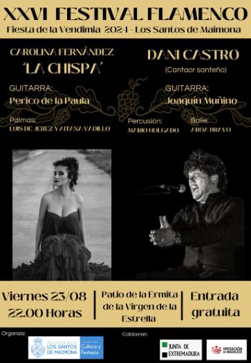 Las actividades enmarcadas en el fin de semana de la Fiesta de la Vendimia comienzan este viernes, 23 de agosto, con el XXVI Festival Flamenco, que en esta edición contará con las actuaciones de la joven promesa del flamenco Carolina Fernández 'La Chispa', acompañada a la guitarra por Perico de la Paula, y el cantaor santeño Dani Castro, acompañado a la guitarra por Joaquín Muñino.