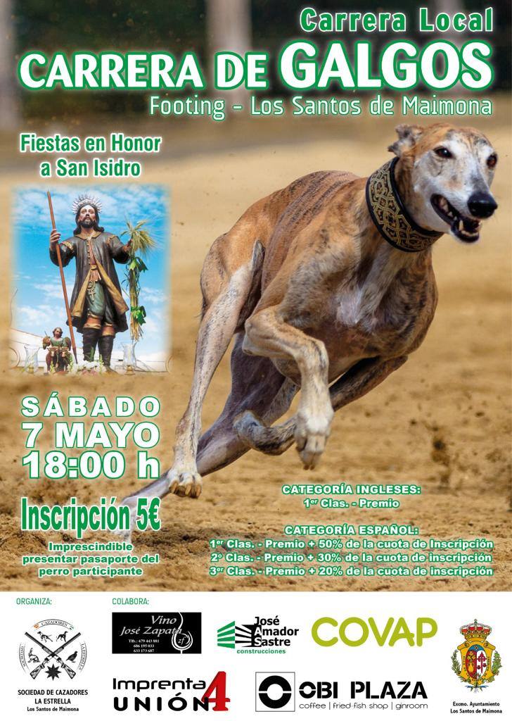 Organizada por la sociedad de Cazadores La Estrella se celebrará este sábado, 7 de mayo, a las 18.00 en el footing. Se han establecido dos categorías, una para perro ingleses y otra categoría para perro españolComienzan las actividades programadas para celebrar las fiestas en honor a San Isidro este fin de semana con una carrera local de galgos. Organizada por ... la sociedad de Cazadores La Estrella se celebrará este sábado, 7 de mayo, a las 18.00 en el footing.