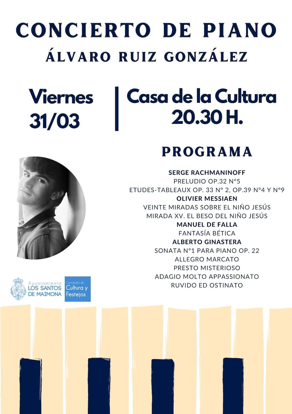 Dará comienzo a las 20.30 horas e interpretará temas de Serge Rachmaninoff, Oliver Messiaen, Manuel de Falla o Alberto Ginastera.El pianista Álvaro Ruiz González, alumno del Conservatorio Superior de Música de Badajoz 'Bonifacio Gil', ofrecerá un concierto de piano en el salón de actos ... de la Casa de la Cultura, este viernes 31 de marzo a las 20.30 horas.
