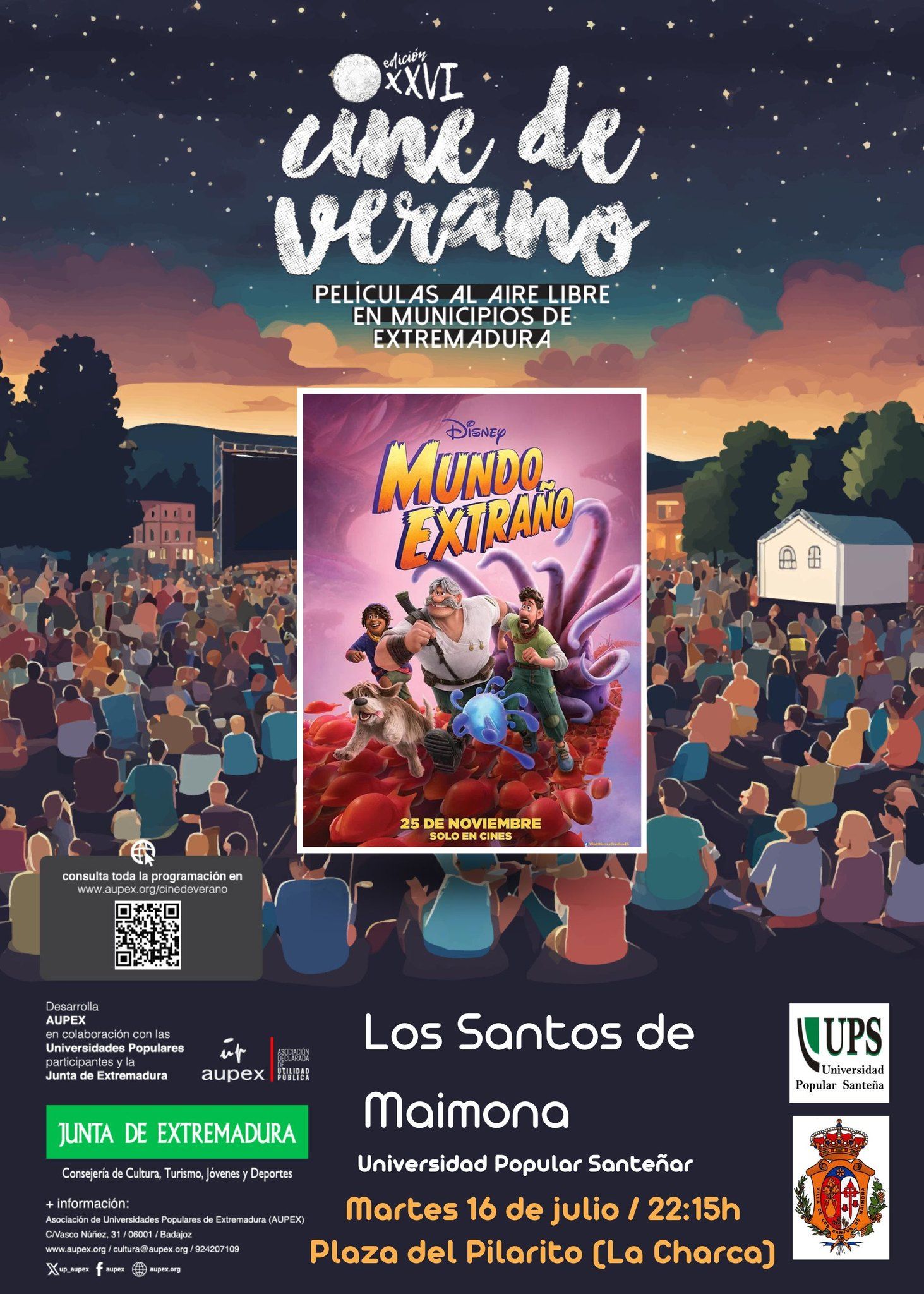 El Cine de Verano es un programa de cine al aire libre itinerante, desarrollado por la Asociación de Universidades Populares de Extremadura (AUPEX), en colaboración con los ayuntamientos participantes, en este caso el de Los Santos de Maimona y su concejalía de Universidad Popular, y la Junta de Extremadura.