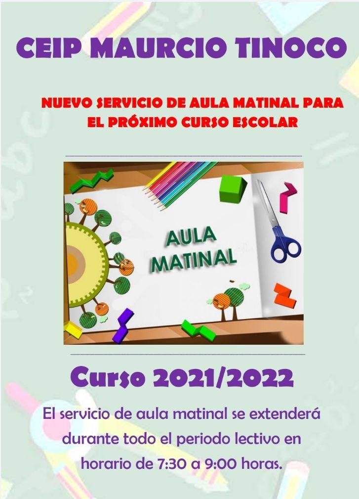 Dicho servicio del aula matinal se extenderá durante todo el periodo lectivo y en el siguiente horario: de 7,30 a 9 de la mañana.El Colegio de Infantil y Primaria Mauricio Tinoco, ya ofrecen plazas para el nuevo servicio del aula matinal para el próximo curso.