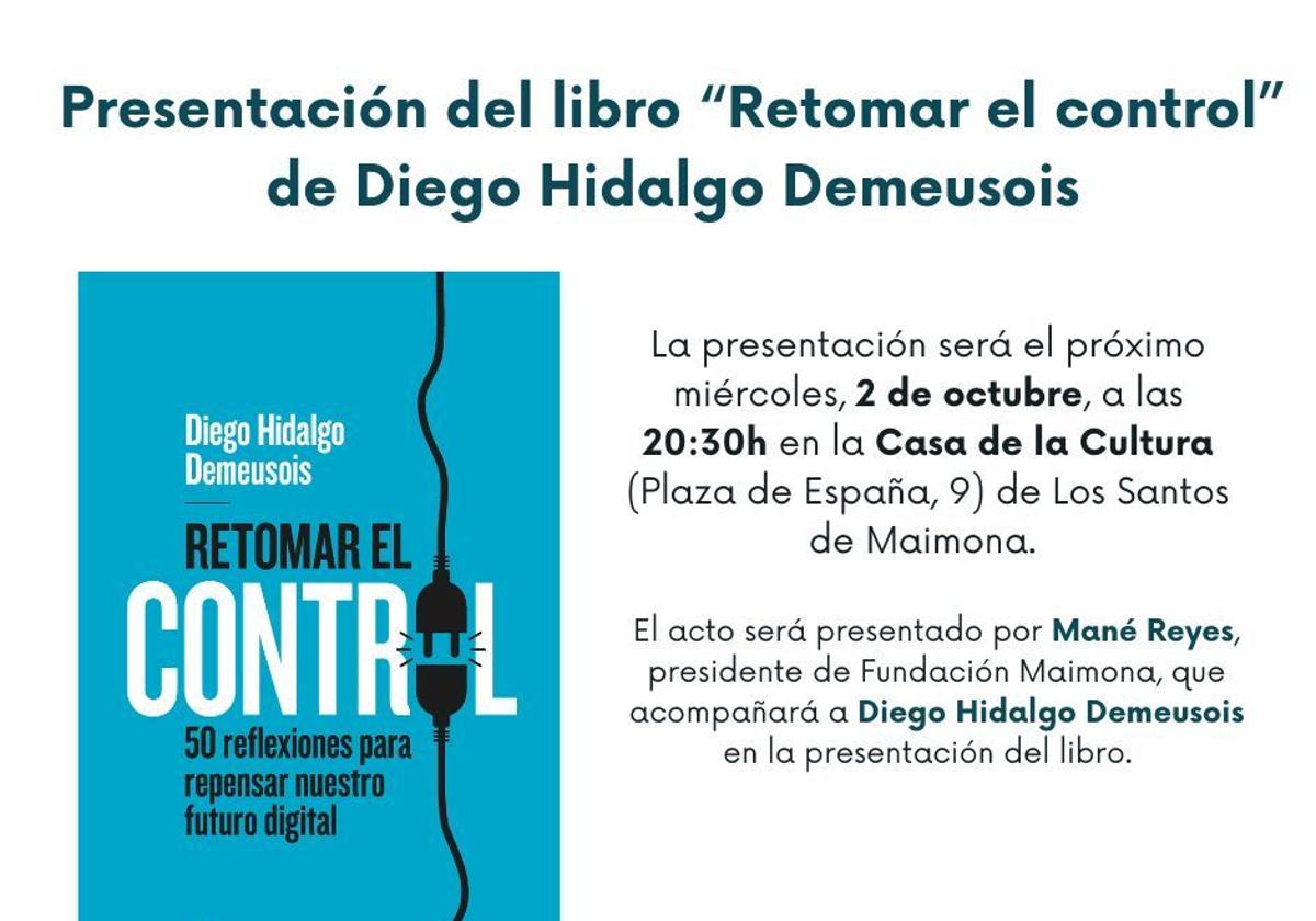 Después de la publicación de su primer libro «Anestesiados» en 2021, Diego Hidalgo analiza en «Retomar el control» la vulnerabilidad de la sociedad frente a la tecnología. En este nuevo libro, el autor reflexiona sobre cómo la transformación digital ha penetrado en ámbitos diversos del día a díaEl próximo miércoles, 2 de octubre, a las 20:30h, Diego Hidalgo Demeusosis (hijo de Diego Hidalgo, patrono fundador de Fundación Maimona) presentará su nuevo libro «Retomar el control» en el Salón de Actos de la Casa de la Cultura.