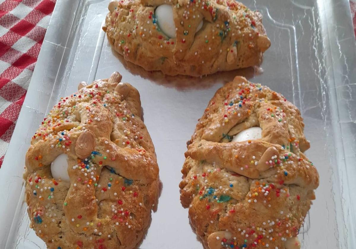 Y nos ha explicado cómo hacerlos: «Freímos el aceite con cáscara de naranja. Dejamos que se enfríe y deshacemos a pellizquito el pan de masa en ella, hasta que se introduzca toda. Seguidamente incorporamos el azúcar y los huevos hasta que se mezcle todo muy bien. Ponemos el anís en grano y la canela, mezclarlo todo, seguido de la harina y el bicarbonato. Arriba se le coloca un huevo cocido y se da la forma a la masa antes de hornear El horno, a 180 grados y sobre 35 minutos». Se le suele espolvorear antes con bolitas de caramelo de colores y pinchar en la masa algunas almendras.