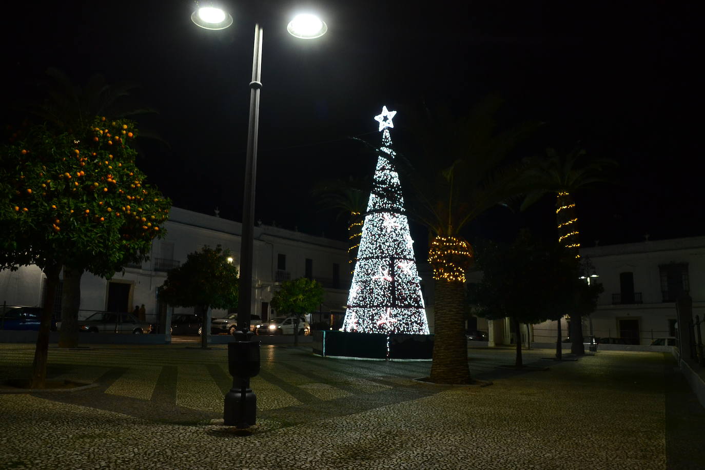 El árbol es majestuoso y, con sus luces nos dice que estamos en Navidad. También las palmeras de la plaza. se han adornado de luces y los balcones de la casa de la Cultura. En los establecimientos comerciales y hostelería se comienzan a ver los adornos navideños.