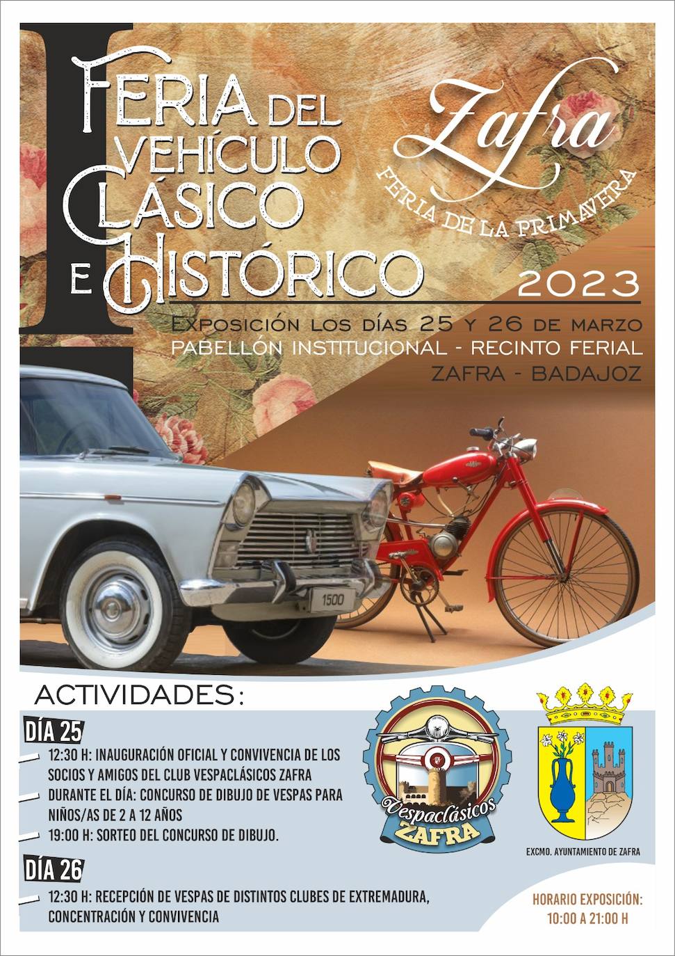 Está organizada por Vespaclásicos Zafra e incluye una convivenciaEl pabellón institucional del recinto ferial de Zafra acoge los días 25 y 26 de marzo una nueva edición de la Feria del Vehículo Clásico e Histórico, en el que habrá unos 70 vehículos. Una actividad organizada por la Asociación Vespaclásicos, que está enmarcada en el programa de actos de la Feria de Primavera que se celebra este fin de semana.