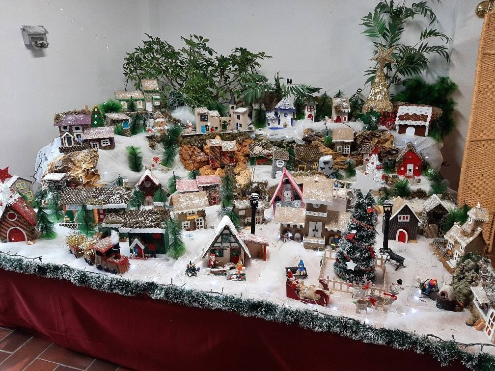Esta recreación de un pueblo nórdico ha sido realizada por las monitoras del taller de manualidades del hogar con la ayuda de socias que han elaborado estas casas, partiendo de cajas de cartón de diferentes tamaños y dispuestas de manera que en el conjunto dé la sensación de un pueblo al que no le falta ni la pista de esquí ni un teleférico.
