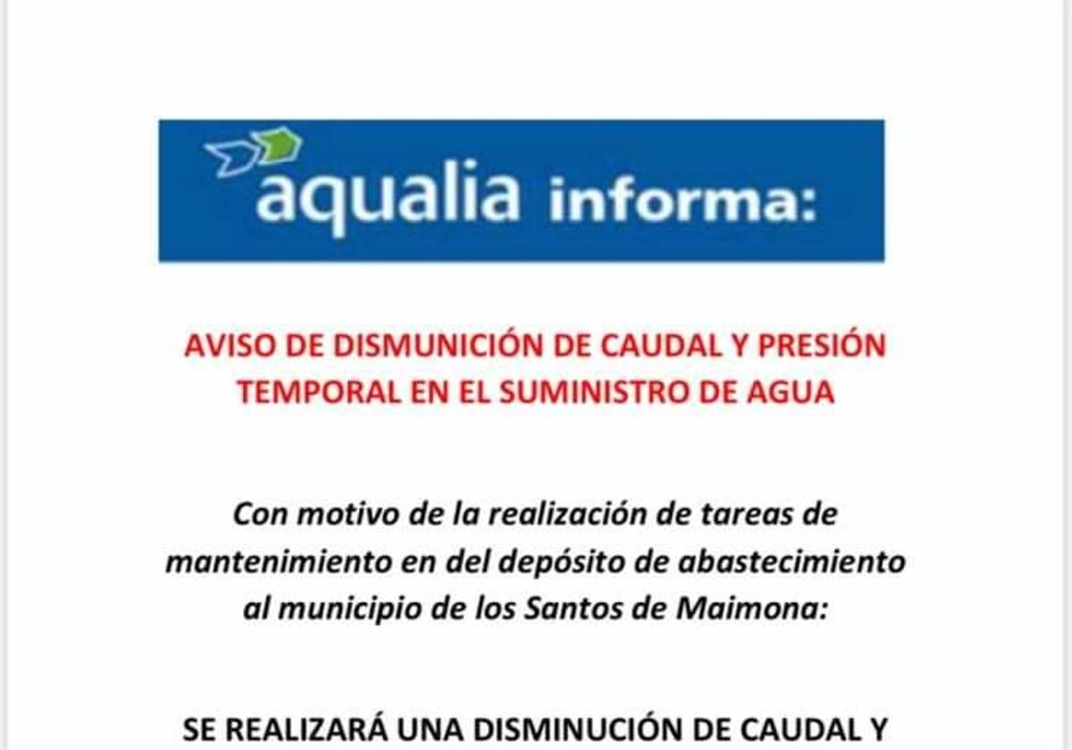 Según el aviso de Aqualia, habrá una disminución temporal del caudal y presión en el suministro de agua el jueves 23 de marzoLa empresa Aqualia informa que, con motivo de la realización de tareas de mantenimiento en el depósito de abastecimiento al municipio de Los Santos de ... Maimona, el próximo jueves, día 23 de marzo, se realizará, de forma temporal, una disminución del caudal y presión en el suministro de agua en toda la población de Los Santos de Maimona.