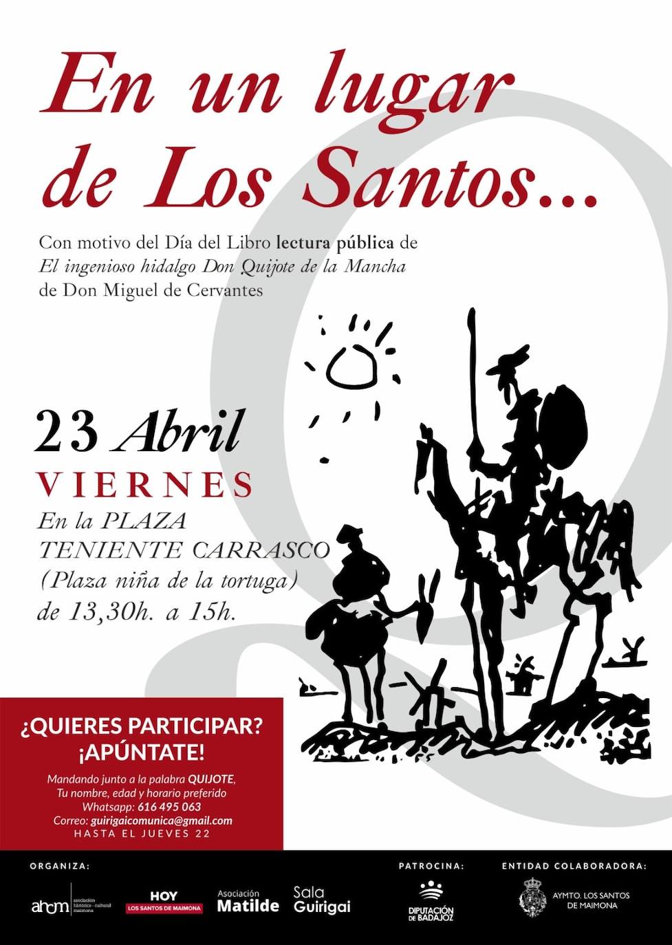 Por el atril, donde se situara una edición del Quijote, pasarán lectores que, sucesivamente, irán leyendo trozos de la obra de Cervantes. Será una manera de unirse a la cultura. .«En un lugar de Los Santos», como reza en el cartel anunciador .