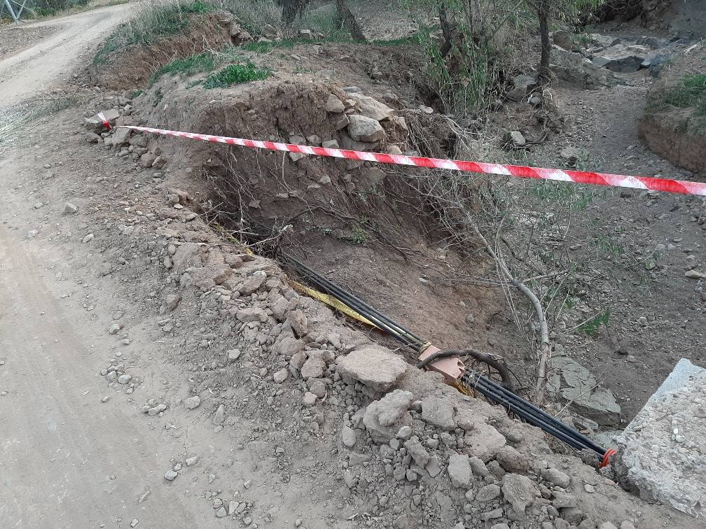 Todavía se ven las consecuencias de la fuerza del agua en muchos caminos donde, como se aprecia en la fotografía, han dejado al descubierto cables de fibra óptica enterrados. Estas lluvias no harán más que empeorar la situación pero por otro lado son muy bien venidas en la agricultura.