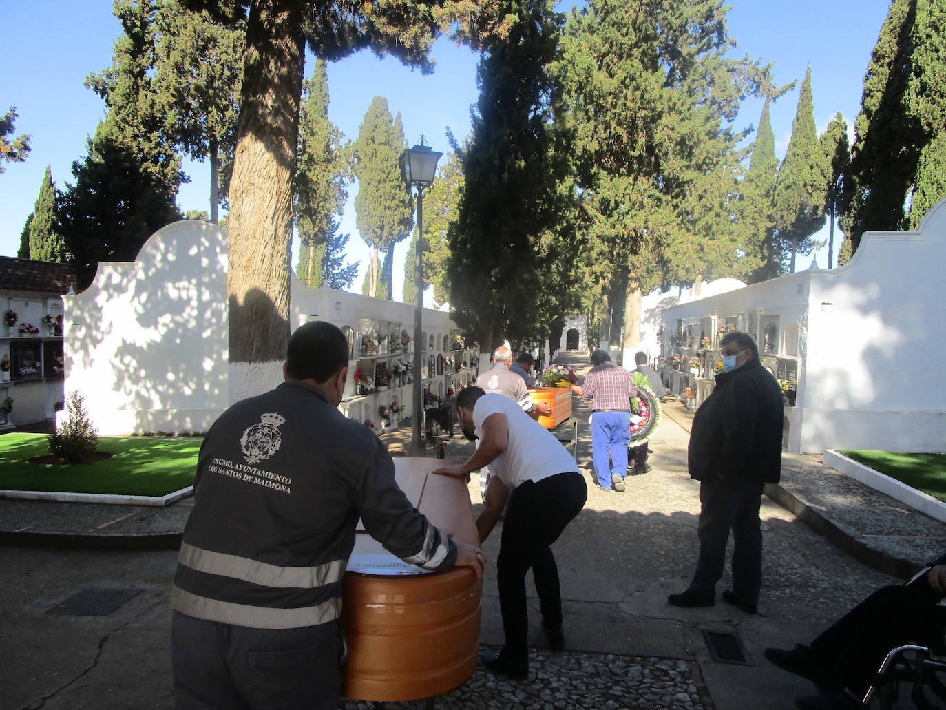 Procedentes del Anatómico Forense de Badajoz, en un furgón, las dos cajas con los cadáveres de Antonio y Francisco, llegaron a la puerta del cementerio donde esperaba uno de los tres primos hermanos de los fallecidos, Juan Luis, convaleciente aun en una silla de ruedas por una operación de rodilla y uno de sus hijos. También estaba el párroco de la Parroquia de Los Santos Leonardo Terrazas, el alcalde de los Santos Manuel Lavado y miembros del equipo de gobierno municipal. El resto de la corporación –PSOE y Ciudadanos- no fue avisada. Por el estado de los cadáveres no se autorizó la celebración de la misa exequial en la parroquia
