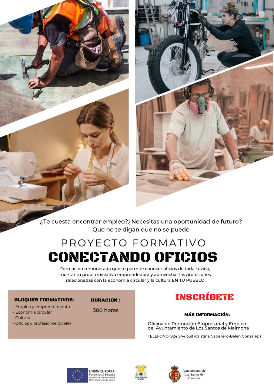 Este proyecto, que será desarrollado por el Ayuntamiento de Los Santos de Maimona, está cofinanciado por el Fondo Social Europeo y la Iniciativa de Empleo Juvenil en el Marco Operativo de Empleo Juvenil. Estas ayudas se gestionarán a través de la Dirección General de Relaciones con las Comunidades Autónomas y Entes Locales del Ministerio de la Presidencia para las Administraciones TerritorialesEl Ayuntamiento de Los Santos de Maimona tiene previsto iniciar el próximo mes marzo el Proyecto de Formación 'Conectando Oficios', una iniciativa con la que se pretende dotar a los jóvenes que no estén estudiando y se encuentren en situación de desempleo de las herramientas necesarias para desarrollar habilidades para la inserción laboral y conocer los oficios de toda la vida, con el objetivo que puedan hacer realidad su proyecto de vida y de futuro en su pueblo. Este proyecto, que será desarrollado por el Ayuntamiento de Los Santos de Maimona, está cofinanciado por el Fondo Social Europeo y la Iniciativa de Empleo Juvenil en el Marco Operativo de Empleo Juvenil. Estas ayudas se gestionarán a través de la Dirección General de Relaciones con las Comunidades Autónomas y Entes Locales del Ministerio de la Presidencia para las Administraciones Territoriales