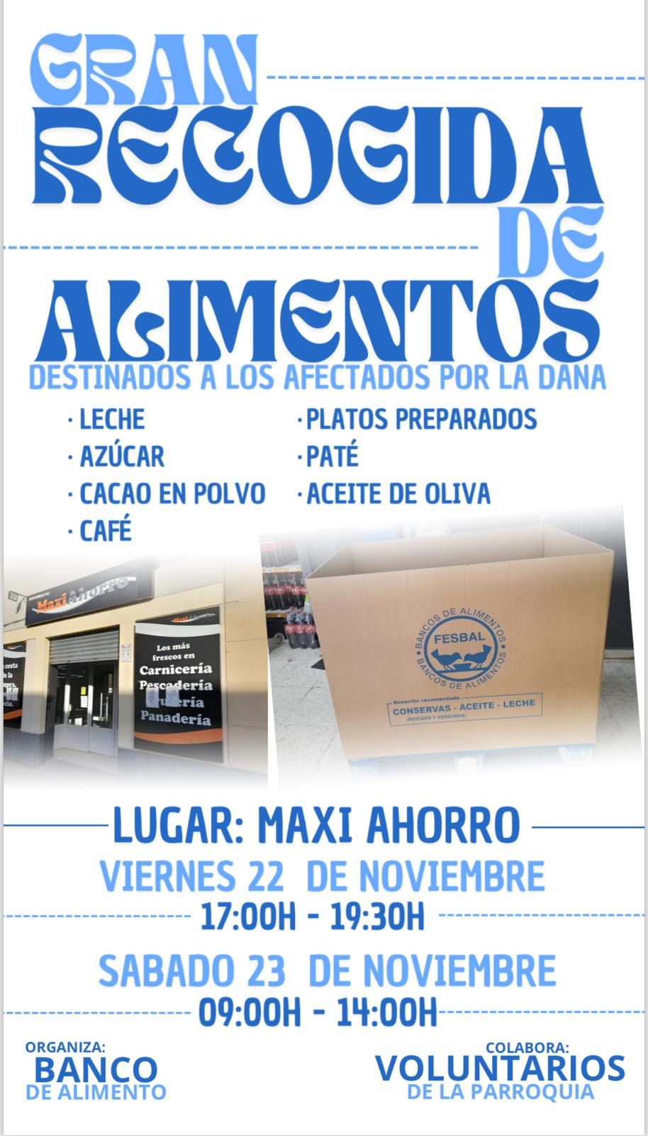 El Banco de Alimentos solicita a los donantes que los alimentos necesarios sean: Leche, azúcar, cacao en polvo, café, platos preparados, paté y aceite de oliva.El Banco de Alimentos, en colaboración con voluntarios de la Parroquia de Los Santos, lleva a cabo este viernes y sábado una gran recogida de alimentos para los damnificados por la Dana en el Levante Español.