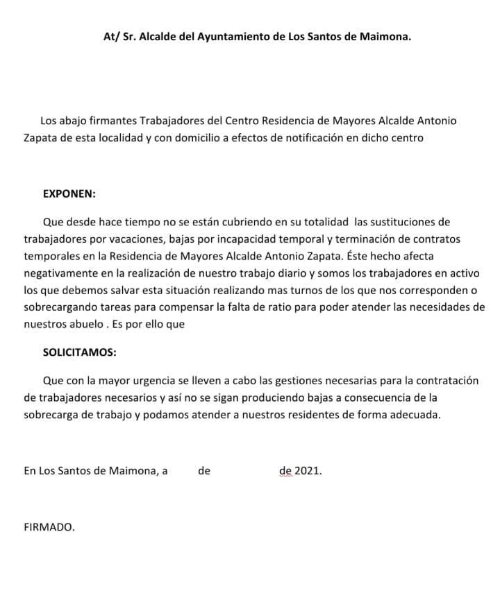 Solo se nos ha dicho, por parte de algunos de los trabajadores, que están recogiendo firmas para acompañar dicho escrito muy simple y correcto de petición al alcalde en el que explican la situación de exceso de presión en los trabajadores por tener que suplir las ausencias justificadas de compañeros.