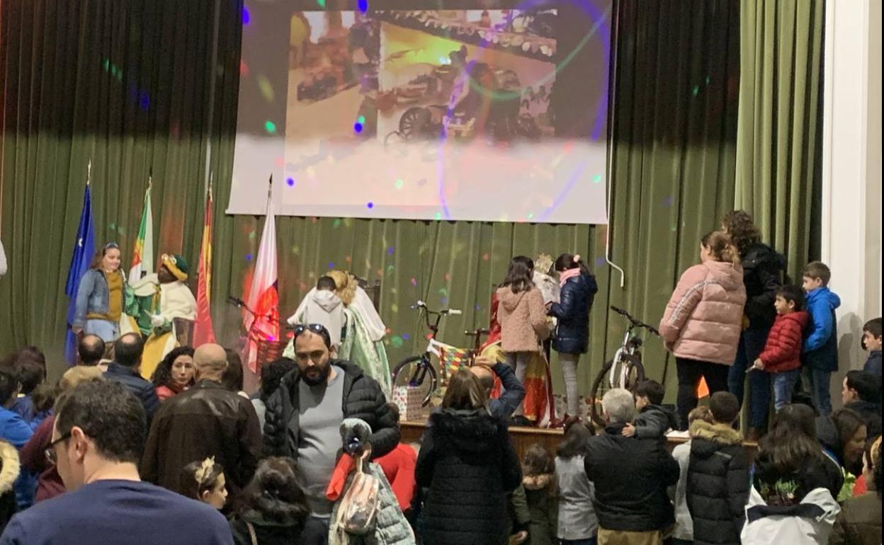 Pasadas las 18.00 horas se abrieron las cortinas del escenario del salón de actos y entre humo aparecieron Melchor, Gaspar y Baltasar ante la atenta mirada de los más pequeños, que ya desde primera hora se congregaban allí para expresarles sus deseos. La gran afluencia de público hizo que el acto se alargara una hora más de lo previsto, hasta casi las 21.00 horas.