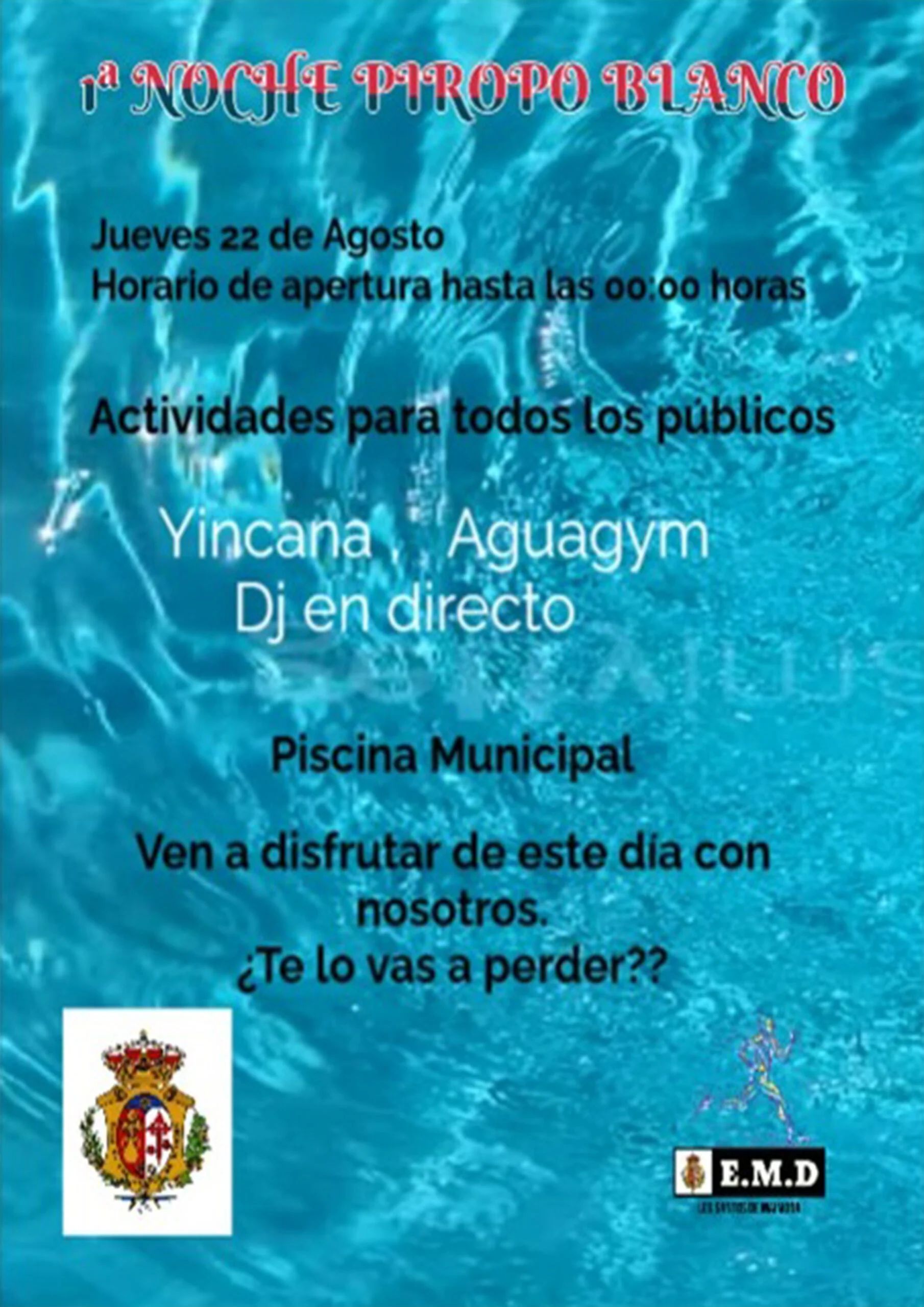 Desde las 21 horas, público de todas las edades podrán disfrutar de yincanas, tanto en seco como en el agua, se realizarán talleres de manualidades conducidos por monitores de la Universidad Popular Santeña, aquagym, también dirigido por una de las monitoras deportivas del ayuntamiento; y, habrá música en directo con un DJ.La Concejalía de Deportes del Ayuntamiento de Los Santos de Maimona, a través de la Escuela Municipal de Deportes, ha organizado una actividad novedosa en la localidad: la 'I Noche Piropo Blanco'. Será este jueves, 22 de agosto, en la piscina municipal y se presenta como una noche cargada de actividades para todos los públicos hasta las 12 de la noche.