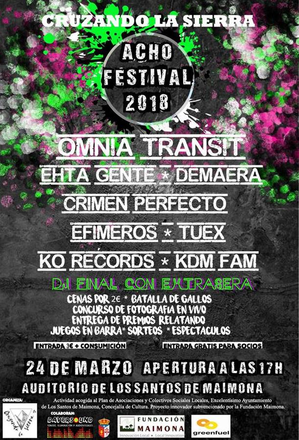 La Asociación Cultural Cruzando la Sierra organiza para este sábado -24 de marzo- la primera edición del Acho Festival 2018, un evento musical que cuenta con la participación de variados grupos del panorama independiente funk, rock, punk, indie-, así como actuaciones de agrupaciones santeñas a las que se sumarán numerosas actividades que se sucederán durante todo el día en el auditorio municipal de Los Santos de Maimona, que abrirá sus puertas a partir de las 12.00 horas. Las entradas se venderán por 3 euros e incluyen una consumición.