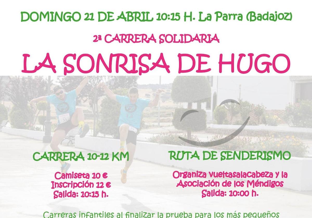 Se celebrará el domingo 21 de abril en La Parra y se han establecido dos modalidades: Una carrera de unos 10-12 kilómetros que partirá a las 10.15 horas y una ruta de senderismo, gratuita y de unos 7 kilómetros de distancia que saldrá a las 10 horas. El Ayuntamiento de Los Santos de Maimona colabora, una vez más, en la segunda edición, La II Carrera Solidaria 'La Sonrisa de Hugo' también cuenta con la colaboración del Ayuntamiento de La Parra.