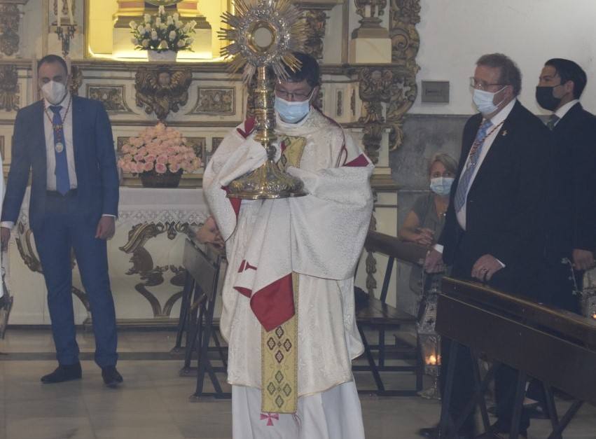 En este año- como ya ocurriera en el pasado por culpa de la COVID- no hubo procesión exterior pero sí se celebró una con la custodia procesional por el interior de la Iglesia y que concluyó en el altar mayor con la bendición a todos los asistentes.