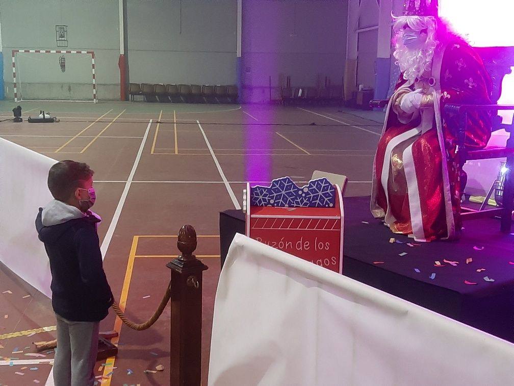 Sin embargo llevar a los Reyes Magos al Pabellón Antonio Luis Galeas, en la Chaca, y permitir que los niños de Los Santos pudieran ver a SSMM con todo tipo de medidas anti covid, fue un éxito del ayuntamiento que puso música, encendió luces de colores, hubo confetis… todo perfecto y además seguro, porque el recorrido que hacían los niños- citados por edades durante la mañana y tarde del 5 de enero y algunos acompañados de un adulto- era tan amplio como fue posible, de manera que nunca coincidían dos niños de distintas familias ante los Reyes. Algunos llevaban sus cartas y a todos, los Reyes les dirigieron unas palabras. Los servicios municipales – trabajadores del Ayuntamiento y Policía Local - llevaron a cabo labores de vigilancia y todo el que entraba en el pabellón se lavaba las manos con el gel dispuesto. Las Ampas de los tres colegios colaboraron en esta recepción de los Reyes Magos, Melchor, Gaspar y Baltasar quese encontraban distanciados en un pasillo hecho en el pabellón.
