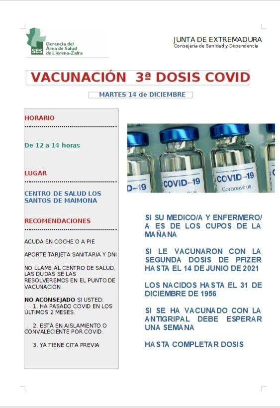 La Gerencia del Área de Salud de Llerena-Zafra hace un nuevo llamamiento a santeños para recibir la tercera dosis frente a la COVID. Será mañana, martes 14 de diciembre, de 12 a 14 horas en el Centro de Salud de Los Santos de Maimona. Se debe aportar la tarjeta sanitaria y el DNI.