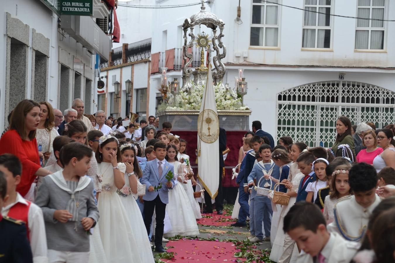 Las flores que adornaban muy elegantemente el paso con la custodia se ofrecieron en parte con las flores que aportaron los niños y niñas de primera comunión. Dicho paso es el del señor Triunfante en Jerusalén que generosamente lo presta para esta procesión. Dicha hermandad montó un altar en la Iglesia de san Lorenzo. Otro se instaló en la calle Diego Hidalgo. El cortejo procesional partió de la Parroquia y se adentró por la plaza Chica, calles Sevilla, Tetuán, Diego Hidalgo, Vía de la Plata, Altozano, San Lorenzo, Correos, San Miguel y Plaza de España. Todas las calles presentaban unos magníficos adornos florales y de plantas aromáticas que los vecinos colocaron con sumo cariño. También dibujos hechos con sal teñida y serrín. Admirable el trabajo vecinal