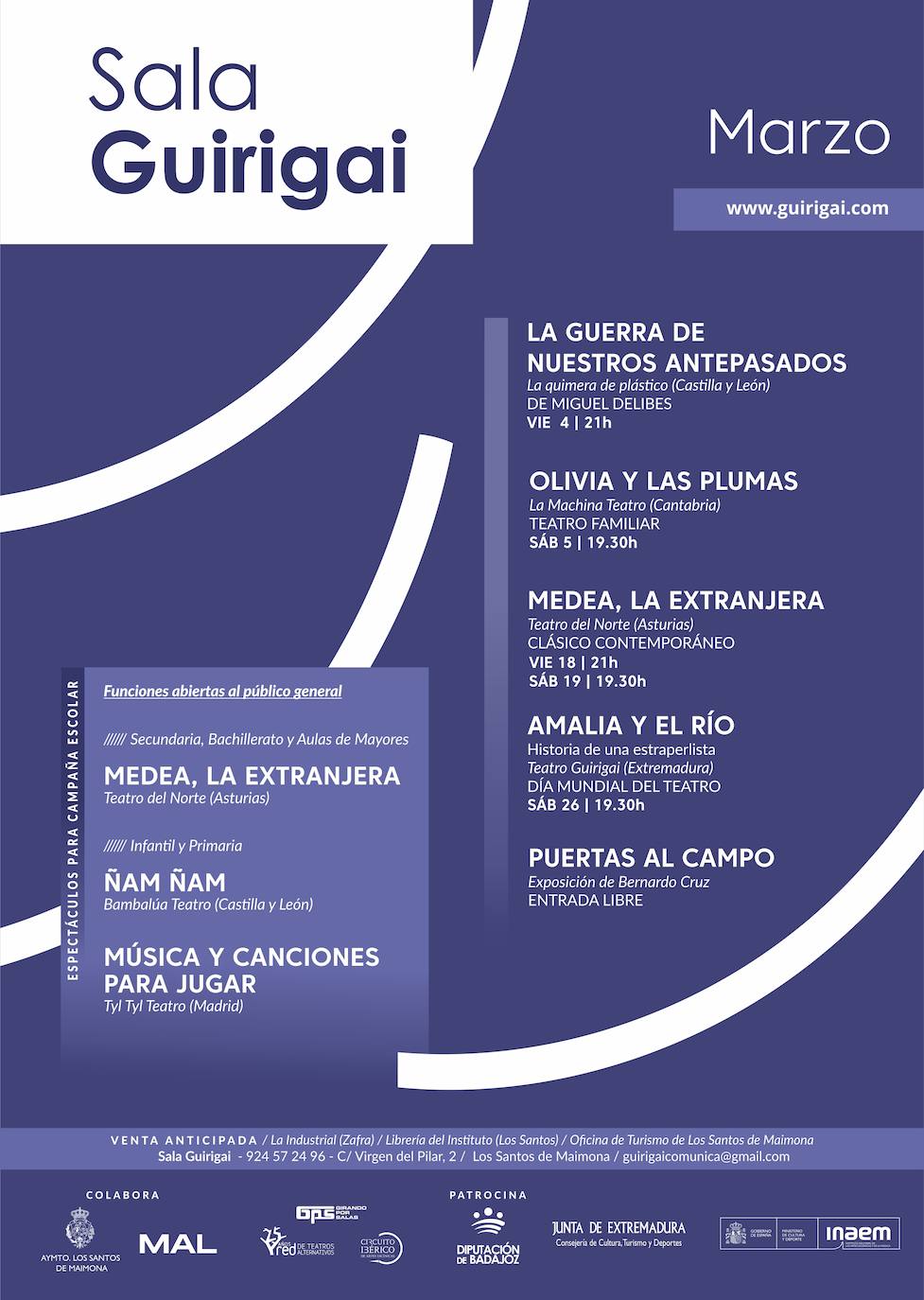 La Sala continúa su campaña escolar teatral abierta al público en general, organiza los encuentros 'Hablemos de la vida a través del teatro', dirigidos al Hogar de Mayores de Los Santos-, y retoma la actividad 'Parar los relojes'La Sala Guirigai de Los Santos de Maimona ofrece durante el mes de marzo una programación de artes escénicas diversa y para todos los públicos, exposiciones fotográficas y una serie de actividades presenciales y en línea dirigidas especialmente a personas mayores y a jóvenes.