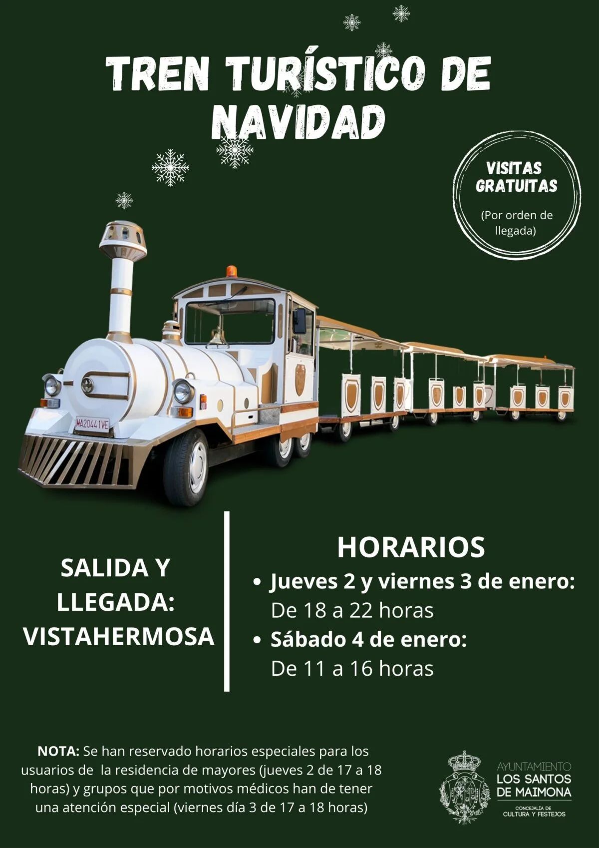 Los primeros viajes del tren estarán reservados el jueves 2 de enero, de 17 a 18 horas, para los usuarios de la residencia de mayores. El público en general podrá disfrutar de esta popular atracción navideña dese las 18 hasta las 22 horas.Durante tres días, desde el próximo jueves 2 de enero, y hasta el sábado día 4, el tren turístico estará recorriendo las calles de Los Santos de Maimona con motivo de la Navidad.