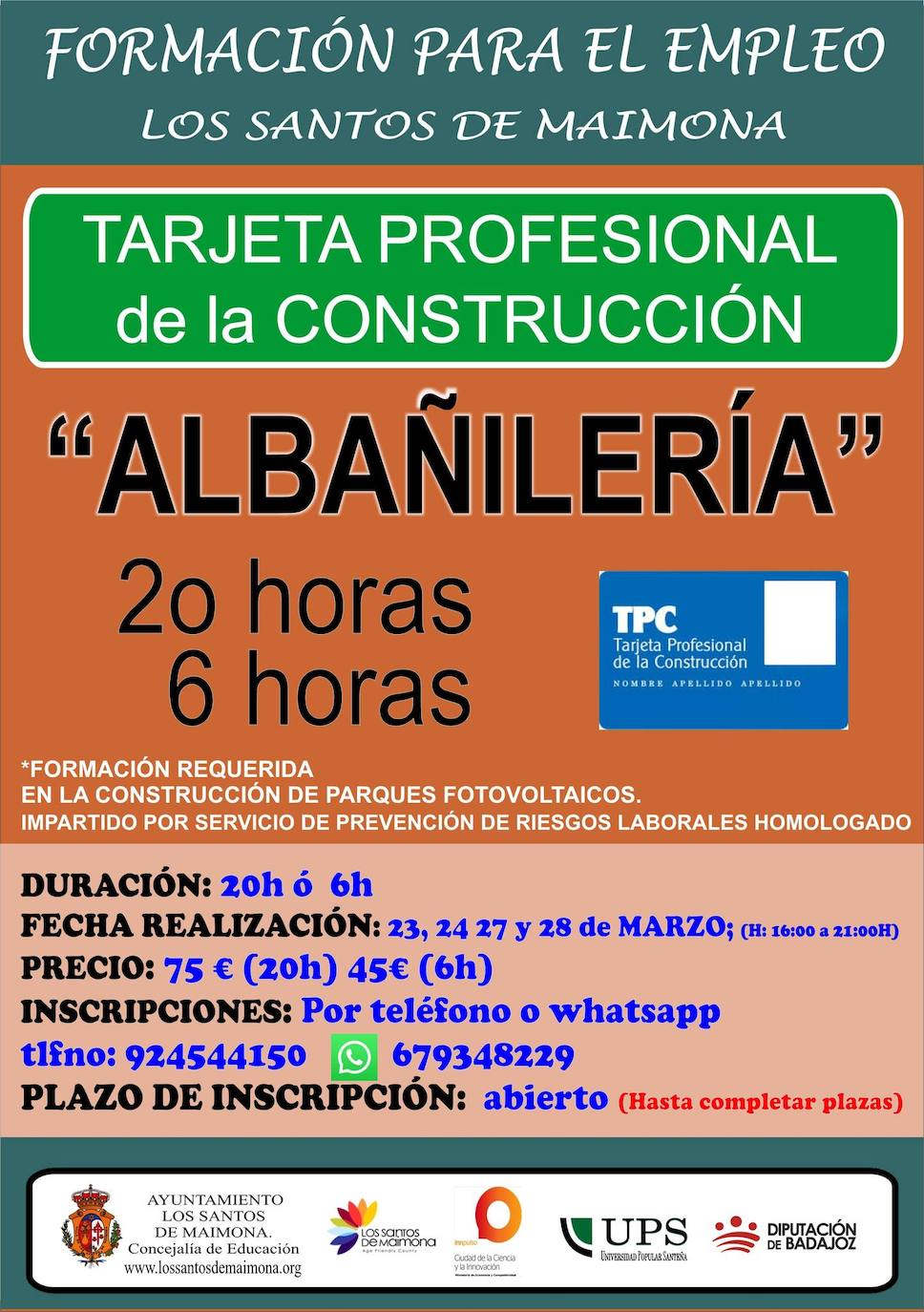 En la Universidad Popular Santeña se impartirá es el curso de Tarjeta Profesional de la Construcción. Especialidad: albañilería