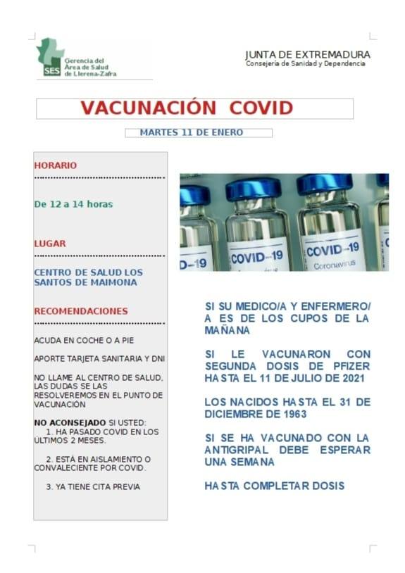 El SES ha convocado para este martes 11 de enero otra vacunación masiva para recibir la dosis de refuerzo de la vacuna covid en el ... Centro de Salud de Los Santos de Maimona entre las 12.00 y las 14.00 horas o hasta completar las dosis existentes.
