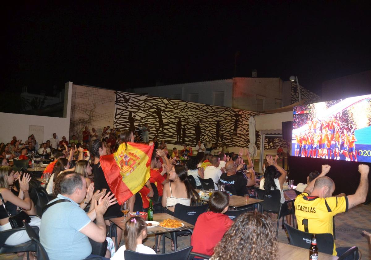 . La mayor pantalla al aire libre la instalaron en el restaurante Obi en la plaza de San José donde los colores de la selección eran bien visibles: camisetas, caras pintadas, banderitas de España….Cuando este domingo la selección española de futbol jugaba frente a Inglaterra la final de la Eurocopa, el pueblo estaba desierto, no circulaban coches ni motos por sus calles. Muchos se refugiaron en sus casas para contemplar con su familia el partido que llegó hasta el final con la incertidumbre del resultado pero que ganó España, con merecimiento.