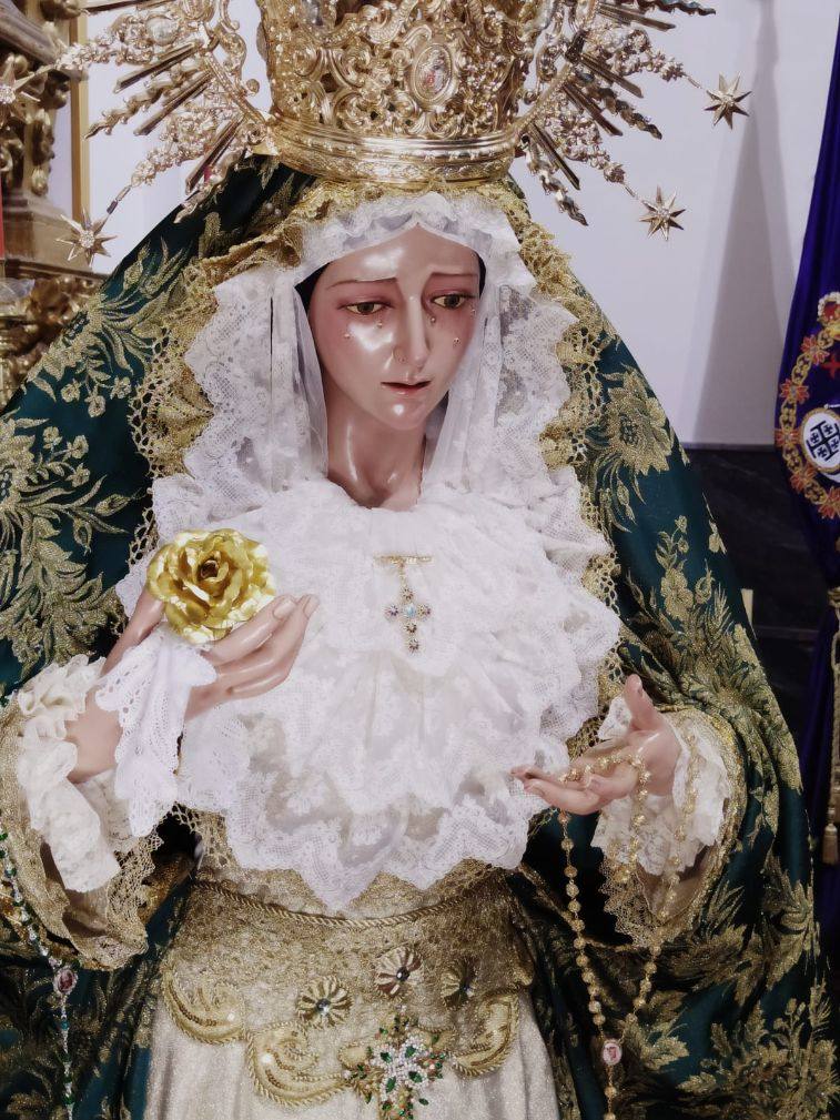 La Virgen ha sido vestida con sus mejores galas y expuesta para el triduo en un lateral del altar Mayor. Este año, debido a la pandemia, no se hará el besamanos de la Virgen.